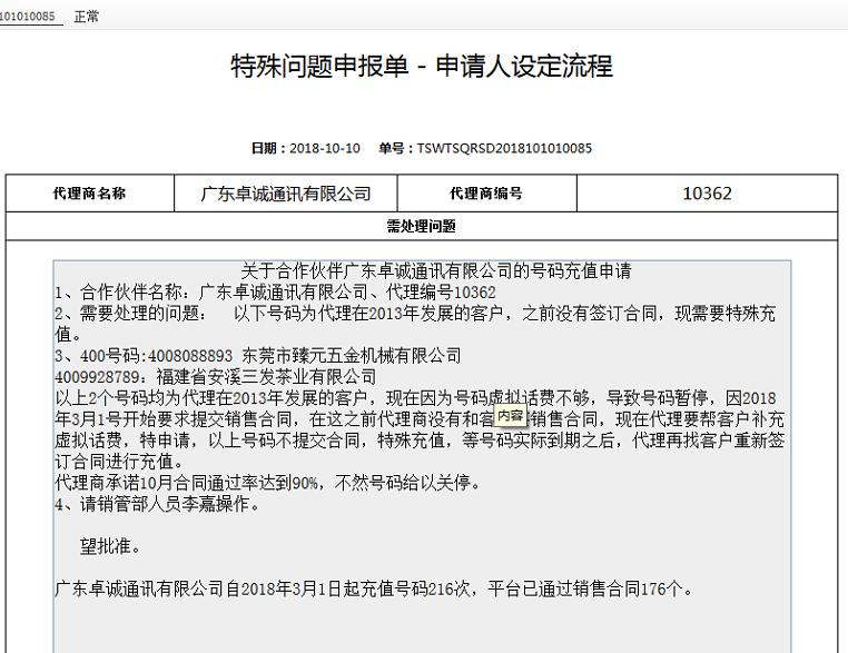 以上2個(gè)號碼均為代理在2013年發(fā)展的客戶,現(xiàn)在因?yàn)樘柎a虛擬話費(fèi)不夠,導(dǎo)致號碼暫停,因2018年3月1號開始要求提交銷售合同,在這之前代理商沒有和客戶簽銷售合同,現(xiàn)在代理要幫客戶補(bǔ)充虛擬話費(fèi),特申請,以上號碼不提交合同,特殊充值,等號碼實(shí)際到期之后,代理再找客戶重新簽訂合同進(jìn)行充值。