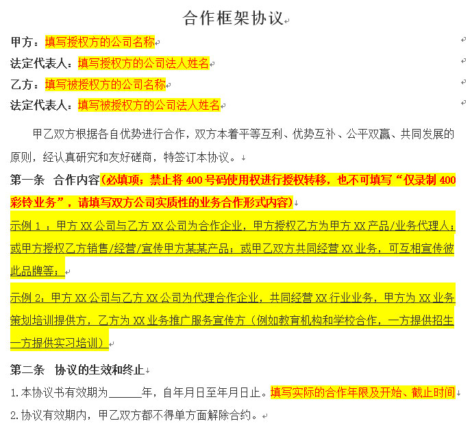 ![]() 第一條 合作內(nèi)容(必填項(xiàng);禁止將400號(hào)碼使用權(quán)進(jìn)行授權(quán)轉(zhuǎn)移,也不可填寫(xiě)“僅錄制400彩鈴業(yè)務(wù)”,請(qǐng)?zhí)顚?xiě)雙方公司實(shí)質(zhì)性的業(yè)務(wù)合作形式內(nèi)容)