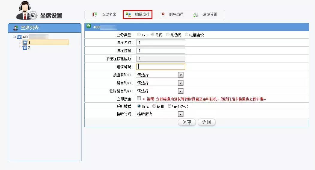 進(jìn)入“通話管理 >> 通話設(shè)置 >> 坐席設(shè)置”頁面,對相應(yīng)節(jié)點(diǎn)接收漏話短信的接收號碼進(jìn)行設(shè)置。選擇流程節(jié)點(diǎn),點(diǎn)擊【編輯流程】按鈕;