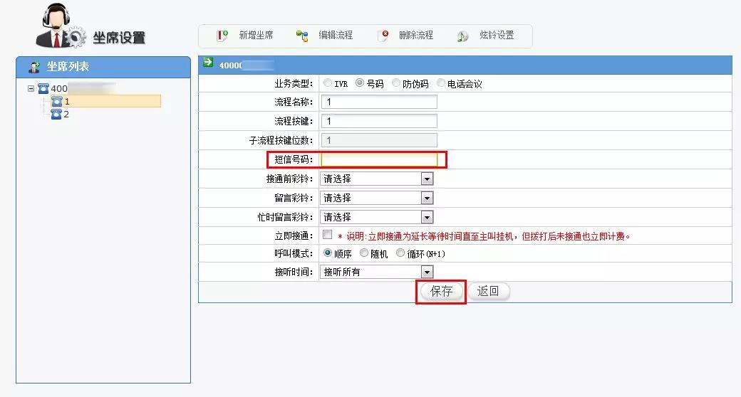 在編輯流程頁面,短信號碼輸入框中輸入該節(jié)點(diǎn)需接收漏話短信的手機(jī)號碼,點(diǎn)擊【保存】即可生效;