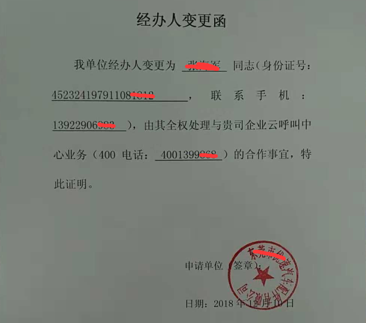 下面我就來一起練級(jí)變更經(jīng)辦人手機(jī)號(hào)碼的流程把| 1、下載經(jīng)辦人手機(jī)號(hào)碼變更函, 文本內(nèi)容: 經(jīng)辦人變更函 我單位經(jīng)辦人變更為 張X軍 同志(身份證號(hào):45232419791108XXXX ,聯(lián)系手機(jī): 139229069XXX ),由其全權(quán)處理與貴司企業(yè)云呼叫中心業(yè)務(wù)(400電話: 40013XX868 )的合作事宜,特此證明。 申請(qǐng)單位(簽章): 日期:2018年12月10日 ![]() 3.自2018年5月17日起,400電話經(jīng)辦人及聯(lián)系方式修改可在平臺(tái)“客戶資料管理”提交“經(jīng)辦人變更”申請(qǐng),上傳經(jīng)辦人身份證正、反兩面及“經(jīng)辦人變更函”,審核通過之后方可修改成功。